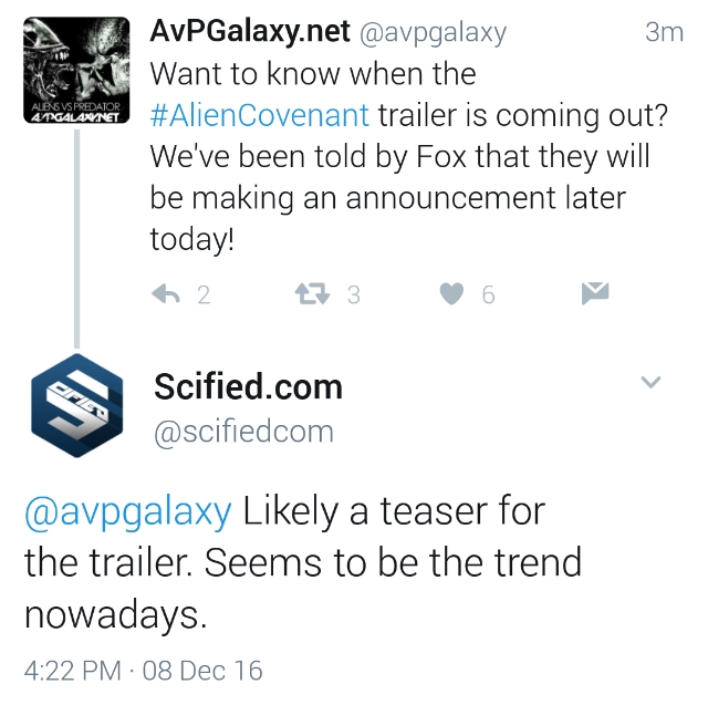 Replies to [UPDATE] Alien: Covenant trailer announcement coming tonight from Fox!