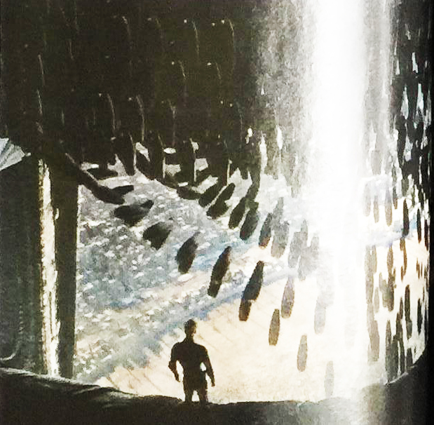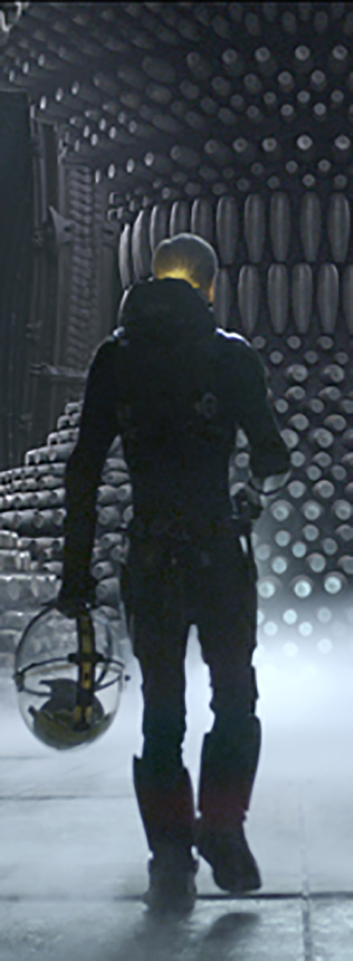 The rounded-bulbous portion of the craft above might house a giant spool of a great number of black goo urns that are piped out the openings like the one David 8 is standing in below.
