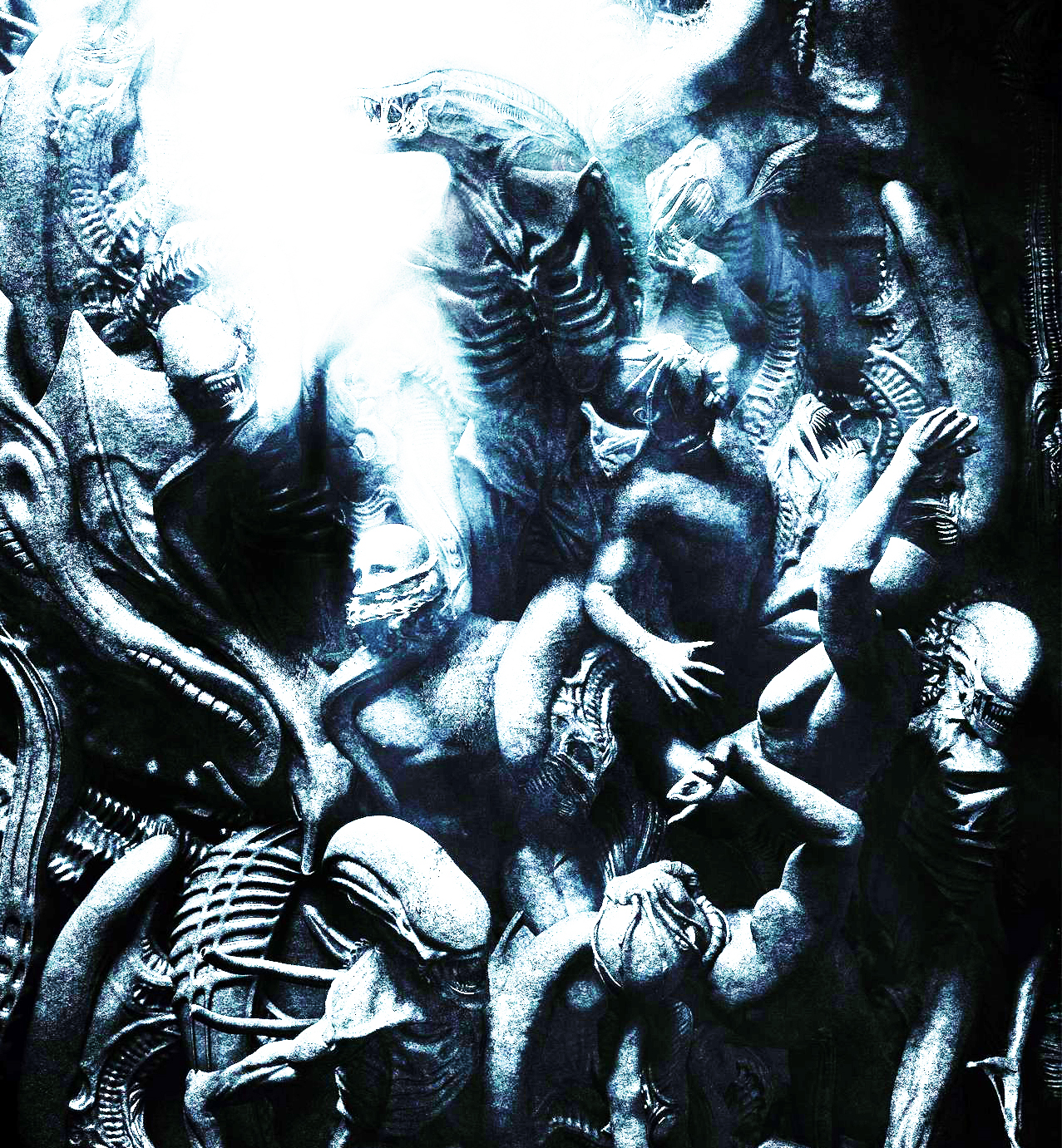 If we go back to Alien and the Derelict and the Xenomorph and the Hive in Aliens, then Aesthetically the Xeno and Derelict shared a connection Genetically, it was like there was some connection. HR Gigers Mural had a Derelict Shaped Object that was constructed from what looks like a Xenomorph this is a hint that he thought the Xeno and Ship had a Genetic Connection. HR Giger felt the Ship was Grown and was like a Plant, and his idea was the Ship Produced the Eggs, in the Egg Silo via Pregnant Bio-Mechanical Bellies...