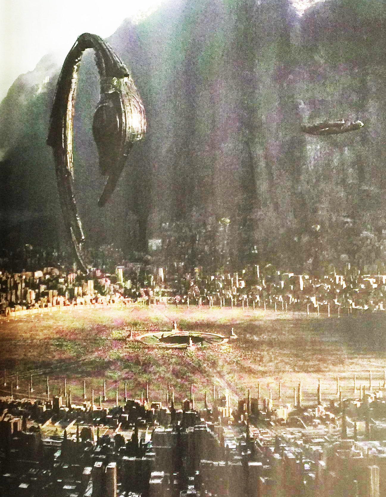 I wonder if the new ship is actually in the foreground in this picture. Edges are sharper than the juggernaut. Also, if it were just above the hole, where is the huge shadow on the mountain behind it? Sun is directly to the right according to pillar shadows on the ground (although I cannot find the juggernaut shadow either). I think the juggernaut is near the hole as it is about the same size and the doors look like the ones from Prometheus. Maybe this is a shot of the other ship flying towards the center of city from our perspective? Just a thought.