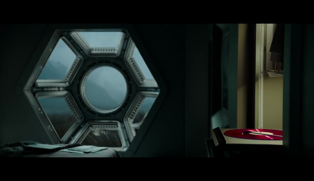 I do remember reading somewhere, maybe from a set report about Daniels' apartment featuring in the film. Could the place where the record is playing be it I wonder. On the trailer at the 10/11 second mark it cuts to a wide frame of the lake. There seems to be a small structure of some kind close to the water. I can't make it out clearly but maybe a peer or jetty for a boat I'd guess. If there was a paradise style landscape shown from a scene on earth I'm not sure why they'd do that. Thematic contrast or something.
