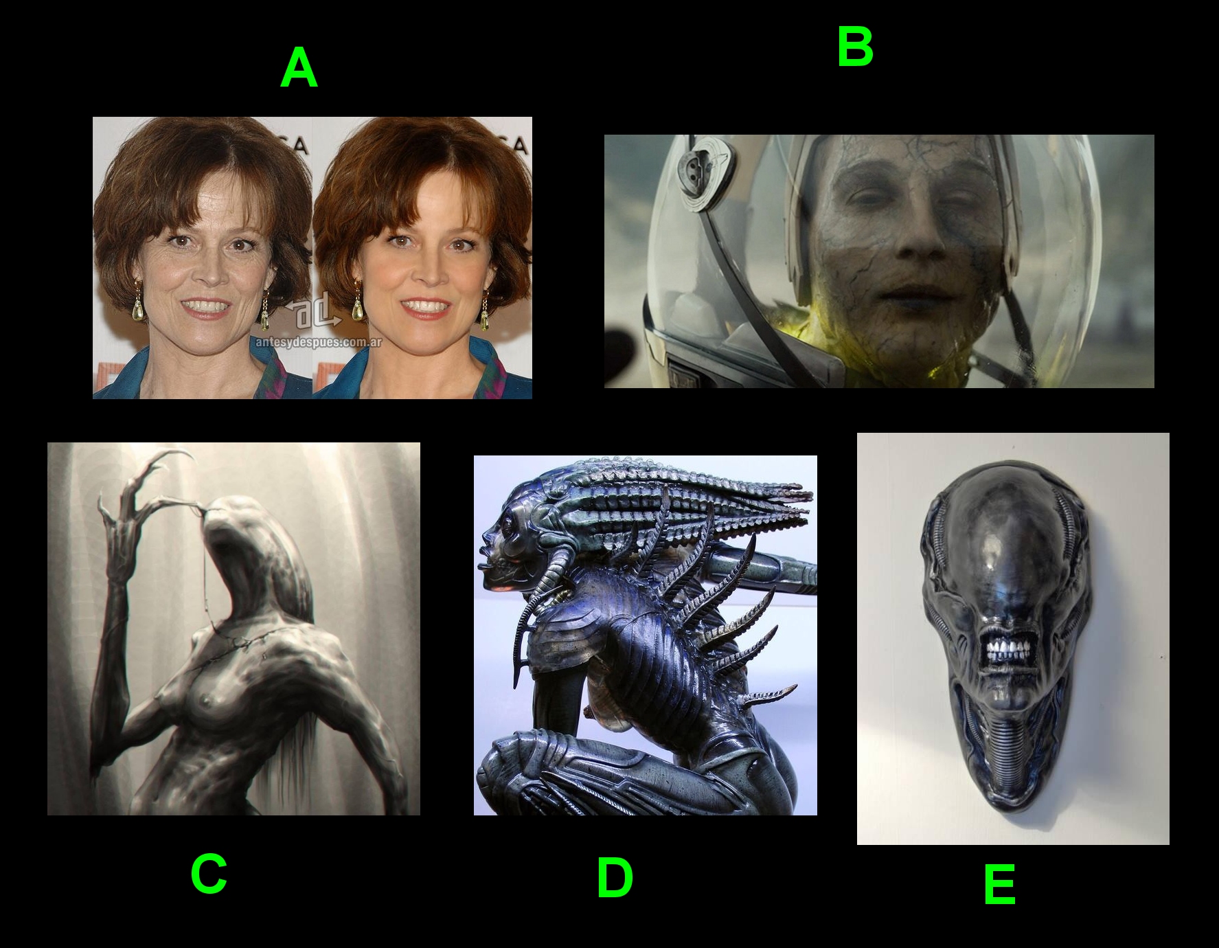 We can CGI overlay Miss Weaver to get results like Image A, but only for a Short Scene, as we reveal she is starting to EVOLVE as the Xenomorph DNA starts to Re-write her Human DNA, we then progress to her Skin becoming Grey and like Holloways in Image B and she could be played like this for Longer where Make-Up can hide her AGE... she then has some other changes like Image C before she Progresses to a Cross Between Image D and E but more Organic, and having some Resemblance to Miss Weaver.
