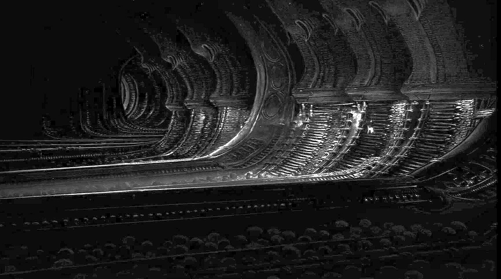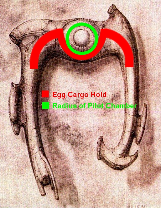I edited the frame with the Kane's descent into the hold, it can be seen it has the shape of the derelict, and, while I agree the height of the hold is approximately the same with that of the derelict, that should be ok, since the pilot chamber has to be in the dome situated on top, the rest of the ship is cargo hold and corridors. If you remember, after entering through the vaginal openings, Kane & Co. went up a wall and even if the wall was not that high, the suggestion was they reached the dome, where the SJ was. Then Kane descended through a hole in the floor, through the deck from the dome/pilot chamber precisely, and one deck only until the hold. He did not pass through any other deck or the hull of the vessel, so the eggs were right below the pilot chamber, right below the dome. Also the structure was the same type for the hold and corridors. If we can still argue if the eggs were produced or not by the Juggernaut itself, for me there is no doubt the eggs were INSIDE the derelict, in the cargo hold. Ridley Scott, Giger and the rest of the production team for Alien said that due to budgetary constraints they gave up the pyramid idea and placed the eggs in the cargo hold of the ship. And it is good it ended like that, becuse until the last moment Giler wanted to have the eggs in the red cylinder silo.