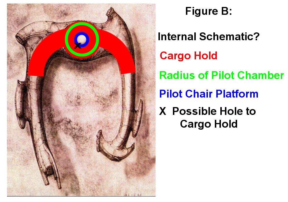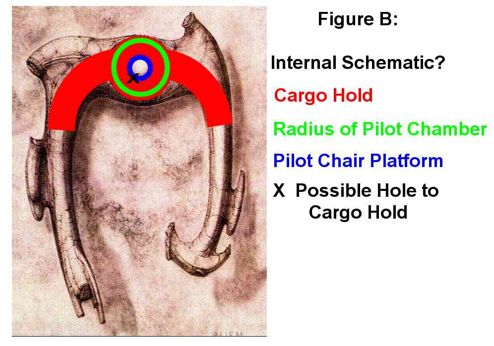 This (Figure B) is just a Approximate, as far as Potentially the Cargo Hold Shape if we assume its to scale to FIT inside, compared to area of the Pilot Chamber which would OVERLAP on top of the Cargo Hold, but the Cargo Hold is NOT a Circle, so its likely wrapped around as in the Image i did, where we could then assume the Pilot Chair Area and Lower into the Ground as shown in Prometheus.