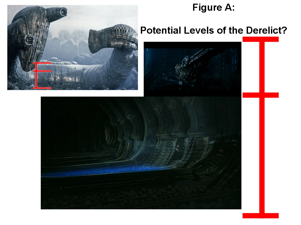This (Figure A) image i am trying to roughly estimate where the Pilot Chamber and Egg Cargo would Lie... in terms of the Derelict.. In ALIEN we never get to follow every second of the Crews Journey, so there could be the Potential of the Pilot Chamber Floor being a certain height off the ground.