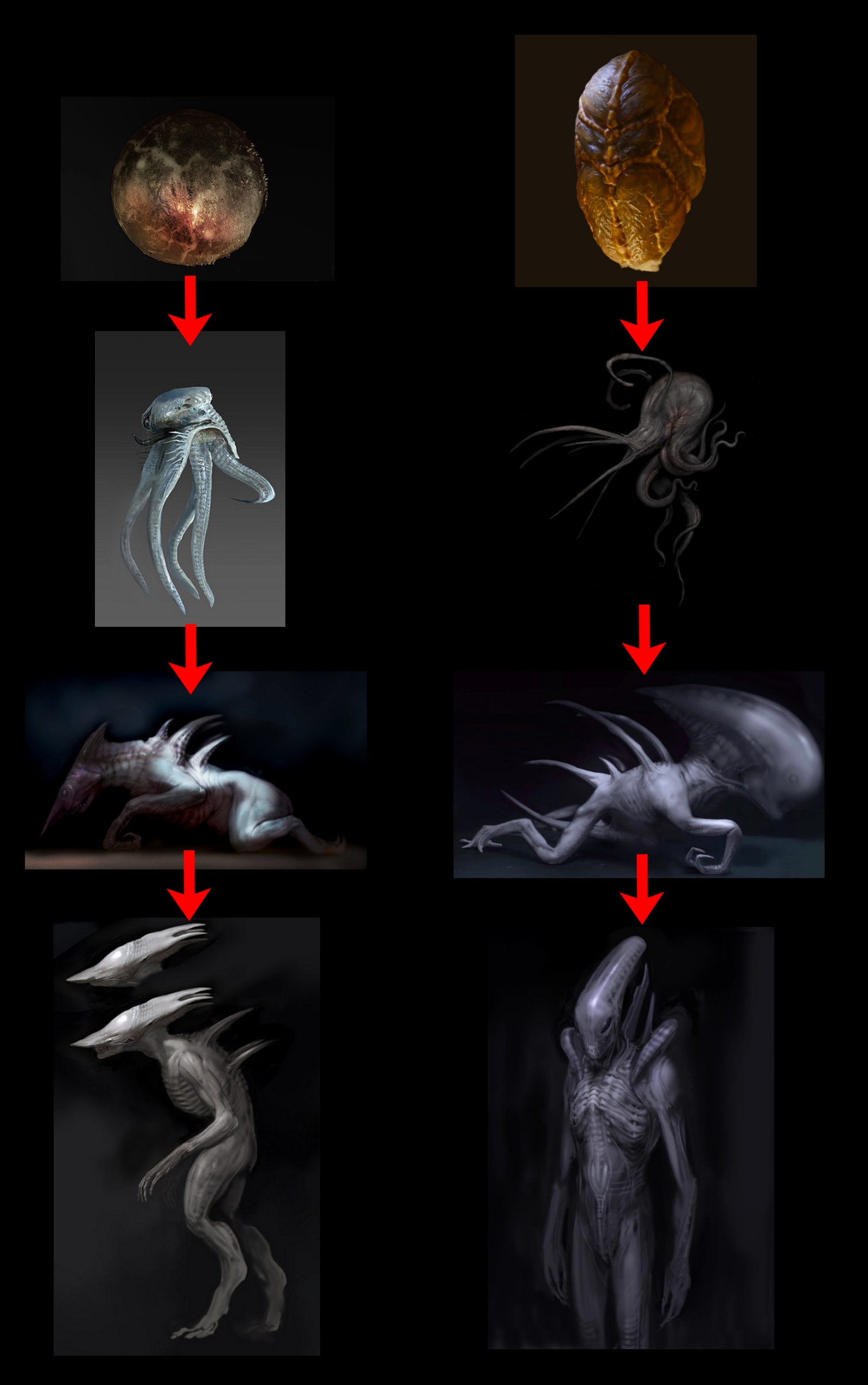 There are some Concept Works around from TWO sources (Artist) that appear to indicate that David had been Experimenting to Create Various Organisms but NONE was a Traditional Xenomorph.