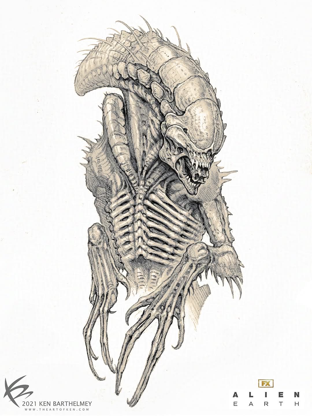 Early concept art for the Xenomorph design in Alien: Earth created by Ken Barthelmey.