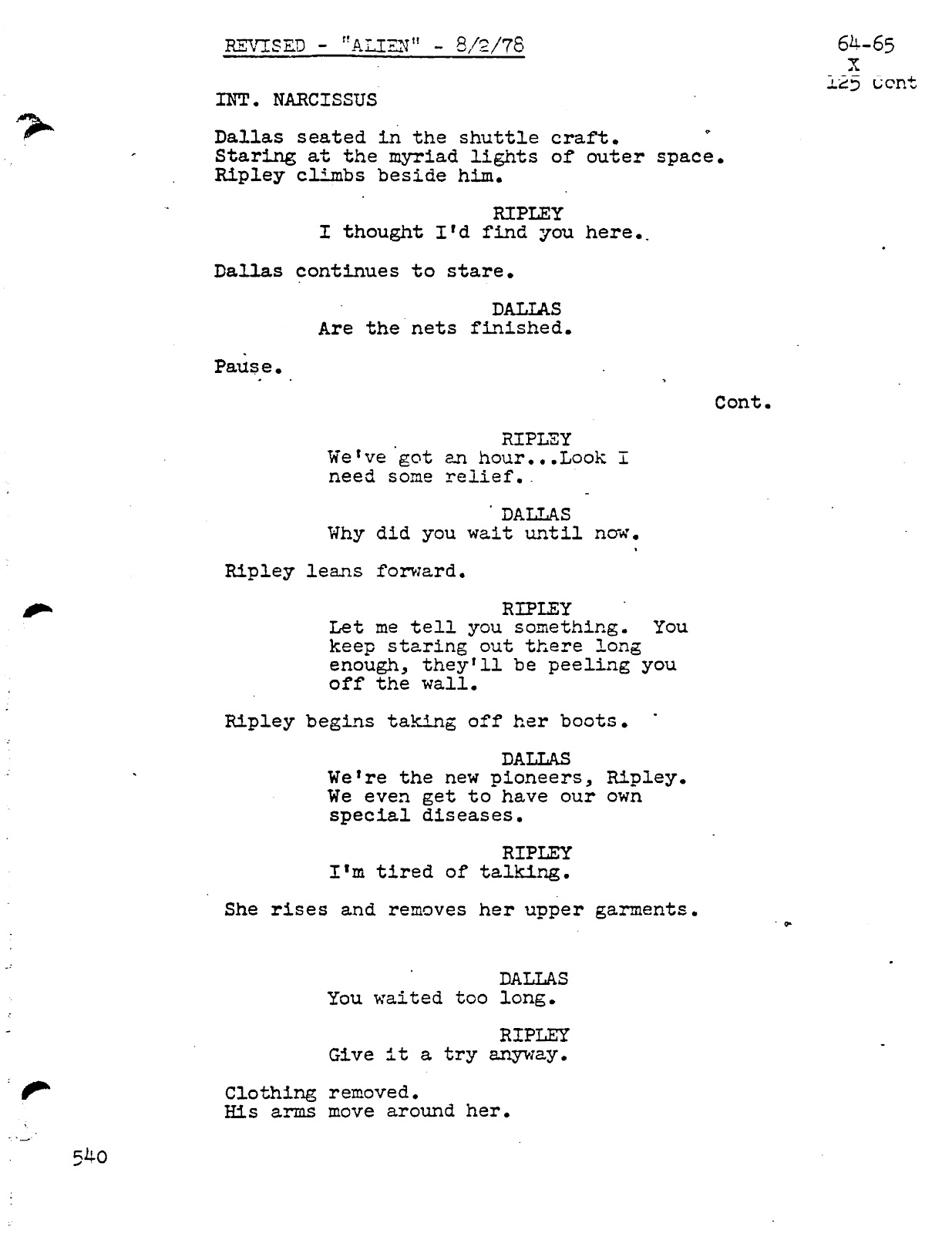 Dallas is seated inside the Narcissus staring outside into the void. Ripley arrives and tells Dallas she needs some relief. Dallas tells her she left it too long, and she begins to remove her clothes. He begins to put his arms around her. This scene was in the Ridley Grams and in the June 1978 Final Draft of the script. Another version of this scene scripted had Ripley and Dallas interrupted by Kane's bloated corpse.