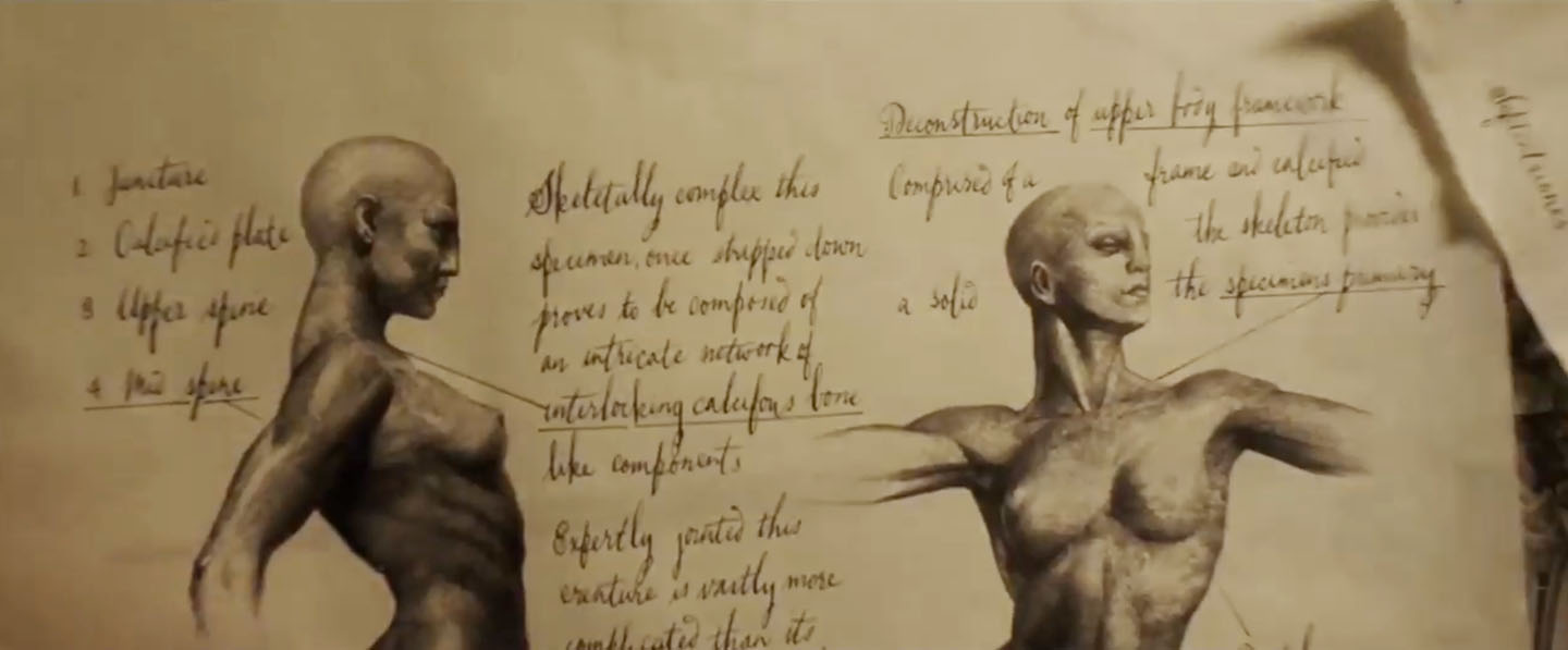 I love the inspirations on show here - Renaissance, Vesalius, Michaelangelo, Leonardo, Damian Hirst, that Van Huygen 'Bodyworlds' plastination guy, Darwin, Victorian botany and taxonomy culture. All that feeds into the imagination surrounding the neomorph/xenomorph origin and biology. I dunno if it diminishes the horror of the otherness/alienness of the xeno in the original Alien - I think I compartmentalize these movies in my mind, and don't fully connect them - but it gives me hours of enjoyment thinking about it all.