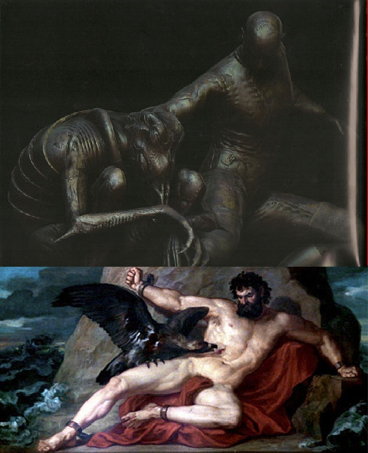 While this fits... such is the Beauty of the Ambiguity, that if we look at the Fresco again and consider the Prometheus Mythos... Then the Angle of the Engineer, the Beaked Appearance to the Organism, the look of Despair/Pain/Sadness on the Engineers Face the position of the Organism, the Tear/Scar on the Engineers Liver Area then the Fresco reminds me more of the one Prometheus Punishment Fresco. My interpretation is the Angles, and look on the Engineers Face seem to match that Fresco.