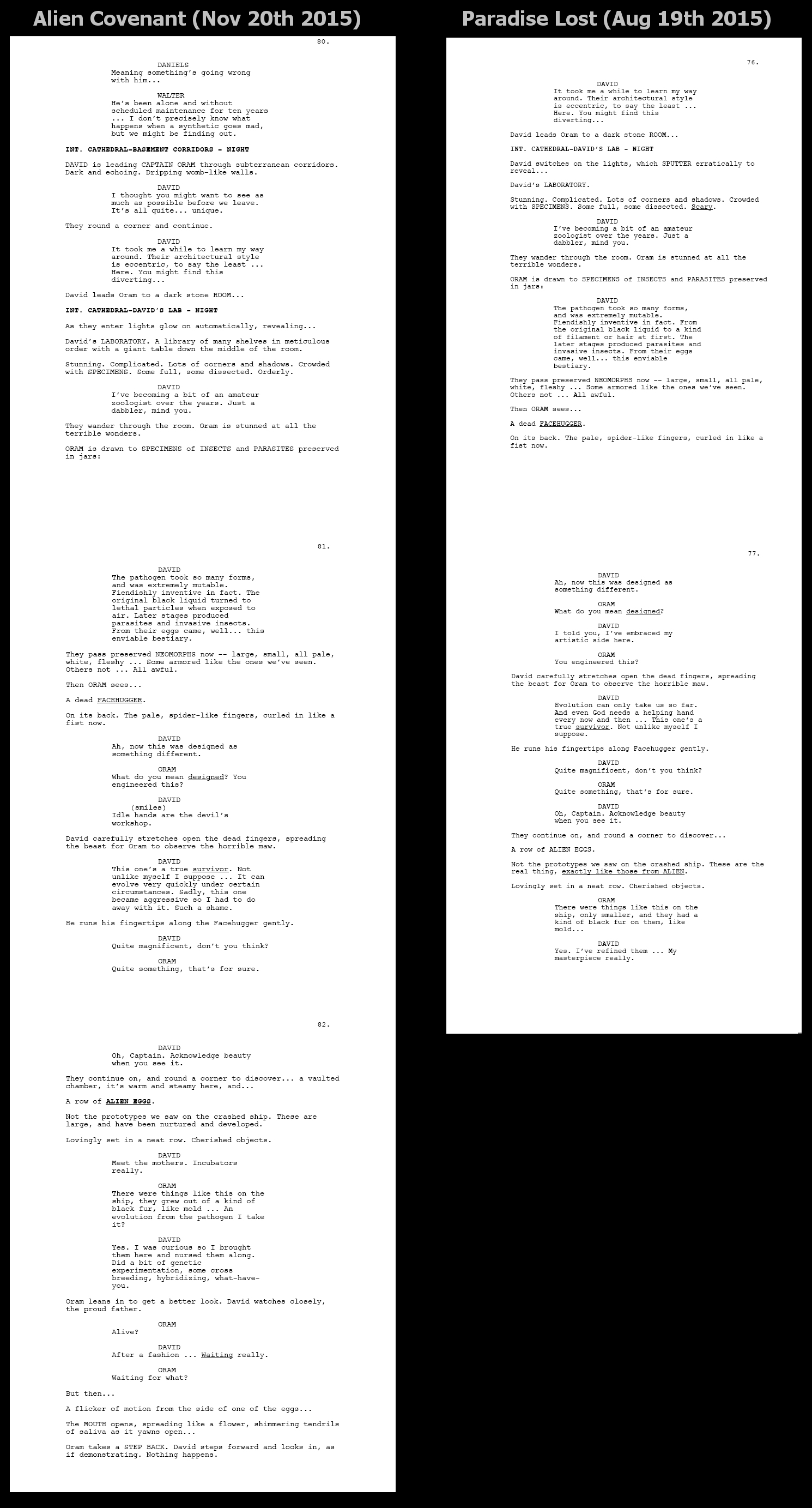 Having Read TWO Drafts (Alien Covenant dated November 2015 and Paradise Lost dated August 2015)