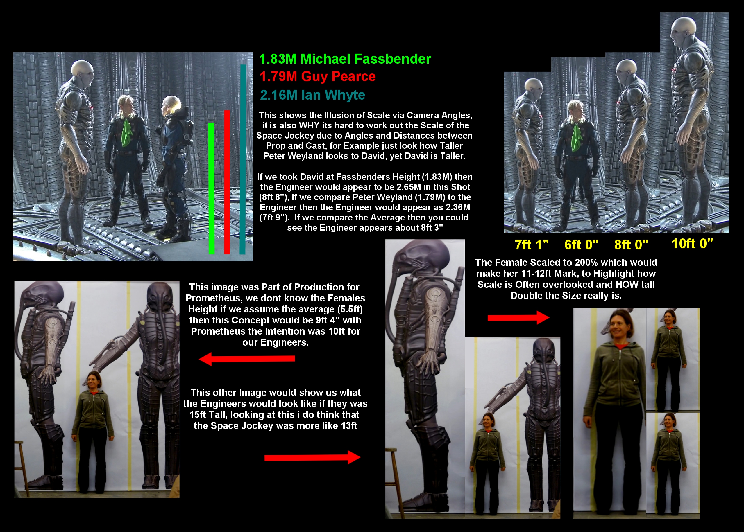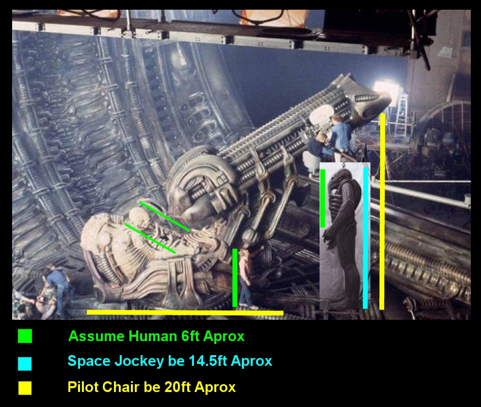 There are 3 Shots that Provide the Best Basis, One with a Space Jockey thats Dead on its Side as shown in the Concept work... with TWO members of Production right by the Side... Using this i worked out the Space Jockey would be about 14.5ft Tall.