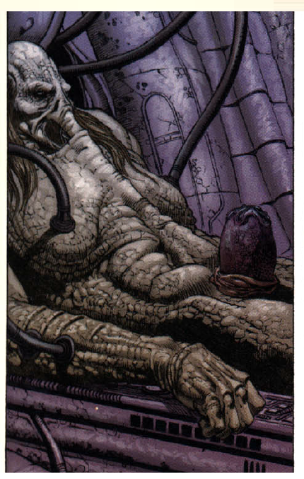 Anyway, they continue inside the huge spacecraft and finally get to a huge room. In the centre of it is the Space Jockey. The “human form was huge - at least 16 feet tall - and it had been there a long time. It looked like a fossil”. Its ribcage had exploded outwards and Marlow comments: “it’s hard to tell where the suit ends and the wearer begins, but it’s not a synthetic. It’s definitely a life form” (That seems to leave out David as the Space Jockey . . .).